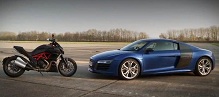 Audi R8 V10 Plus впервые смогла разогнаться быстрее мотоцикла Ducati Diavel по прямой в диапазоне скорости с 0 до 242 км/час, а также быстрее остановиться с 242 до 0 километров в час. Не смотря на то, что мотоцикл весит всего 234 кг и его двигатель имеет мощность 162 л.с., автомобиль Ауди, который весит 1588 кг и развивает мощность 542 л.с., смог побороть мощную мототехнику по скорости разгона с места до 242...