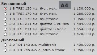 Re: изменения в а4 2012 модельного года Сырой еще конфигуратор (много ошибок) - например: 1. Подлокотника в 120 л.с. нет, а в конфигураторе - есть. 2. Красный перламутр дороже эксклюзивного цвета на 4 тыр. 3. Нет модификаций: 120 л.с. + мульт, 170 л.с.+кваттра.