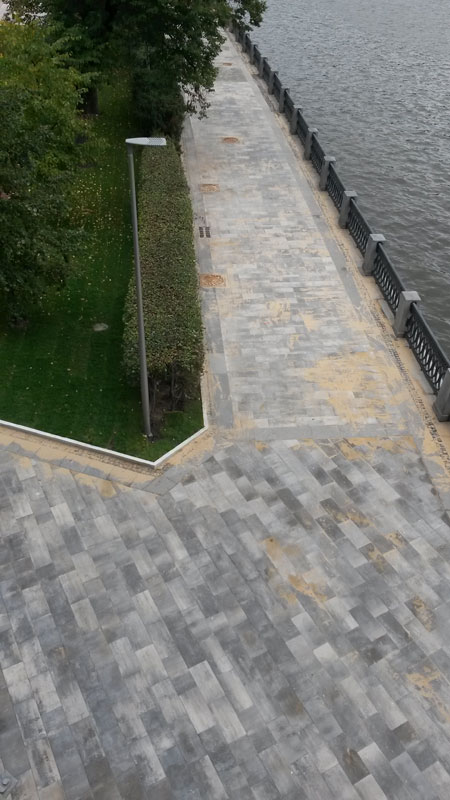 Итак, мы недавно обсуждали гуляльную зону Нескучного сада и Воробьевых Гор. Я рассказал на что наткнулся, мне заявляли, что всё фигня и СС уж точно там всё опупительно сделал. Помимо этого затронем истерически открытую накануне выборов "реконструированную" набережную Лужников. Начали? Начнем мы с этой самой набережной. Я проверил ближайший сектор от Фрунзенской (ТТК) до метромоста (это Лужники). Выглядит панорамно это так: Поближе: По качеству работ: - плитка шатается (при таком размере надо было нанять слепых одноруких таджиков для такого результата) - уложено отвратительно (можно просто перейти через мост и увидеть как надо) - швы не заполнены - горы песка то там, то тут (причем это не песок для швов - слишком крупный!), а местами просто пляжи поперек - лавочек - 0 - урн - 0 - ржавые люки - пограничная брусчатка торчит от уровня асфальта под оградой набережной - новые гранитные бордюры уже массово потюканы, причем не на дороге, где это никого не парит, а на съездах и выездать (например, в пеш.зону к входу-выходу из м.Воробьевы Горы). Абсолютная халтура и недоделка. И это мэр и руководитель ПЖиВ (филиал - Москва) "открывал"?! Переходим метромост, оказываемся на Воробьевской набережной. Там всё гораздо приличнее, но поскольку толпы - не наше, то как и обсуждалось поднимаемся чуть выше. И что мы видим? Вообще-то, это часть экологической тропы для школьников. Хорошо, что дождя не было. В дождь оно выглядит хуже чем так: Кто не понял - это было дорожкой. Потому что дальше оно улучшается: Еще пара минут и позор заканчится. Чем? Новой лестницей! Поднимаемся, в цай раз офигеваем от страшно неудобных лавок (в них поясница висит в воздухе), очевидно, очередной дизигнер из тундры ненадолго отвлекся от сбора оленьих афродизиацных фекалий: А за ними, между прочим, нетронутая историческая красота: И не успевает глаз усладиться как за кустами обнаруживается еще одна нелепица: И даже милый мостик уже не радует как мог бы: Проходим еще немного, спускаемся на пафосную показную набережную. Немного проходим и утыкаемся в кусок, который меня уже давно приводит в замешательство. Поскольку обломки асфальта замазаны бетоном и сверху присыпаны крошкой: Ходить неудобно, на роликах невозможно (а наверху, между прочим, - дорога и машины ездят!), на самокате тоже, а про скейт и просто не заикнешься. Еще очень милая ливневка: Туда котенок провалится целиком! Проходим мост ТТК и выходим на набережную Нескучного Сада. Все вроде бы неплохо, только два нюанса: - протечки ливневки: течет всё хуже и сильнее, даже тяжеленная историческая отделка разваливается: - а это милый лайфхак от администрации: Самое смешное, что ливневку, похоже, убили во время прошлогодной реконструкции, когда закладывали кабели и ставили столбы освещения. Так что местами фонтанирует прямо из столбов (да-да!). Я еще раз скажу - это качество прошлогодних работ! А помните я рассказывал как неумели брошенный "золотой" рулонный газон сдох? Его поменяли. И забросили. Сейчас он зарос крапивой: А знаете в чем еще прикол? Убитая ливневка в дожди намывает земли-грязи на пешеходной дорожке по щиколотку. А "убирают" это просто - поливалка сносит струей прямо в Москва-реку. Так что скоро придется пригонять технику и углублять дно снова. Хотя помните про планы "реконструкции и ремонта набережных" на 2017? Подготовочка явно уже идет ;-) Набереж