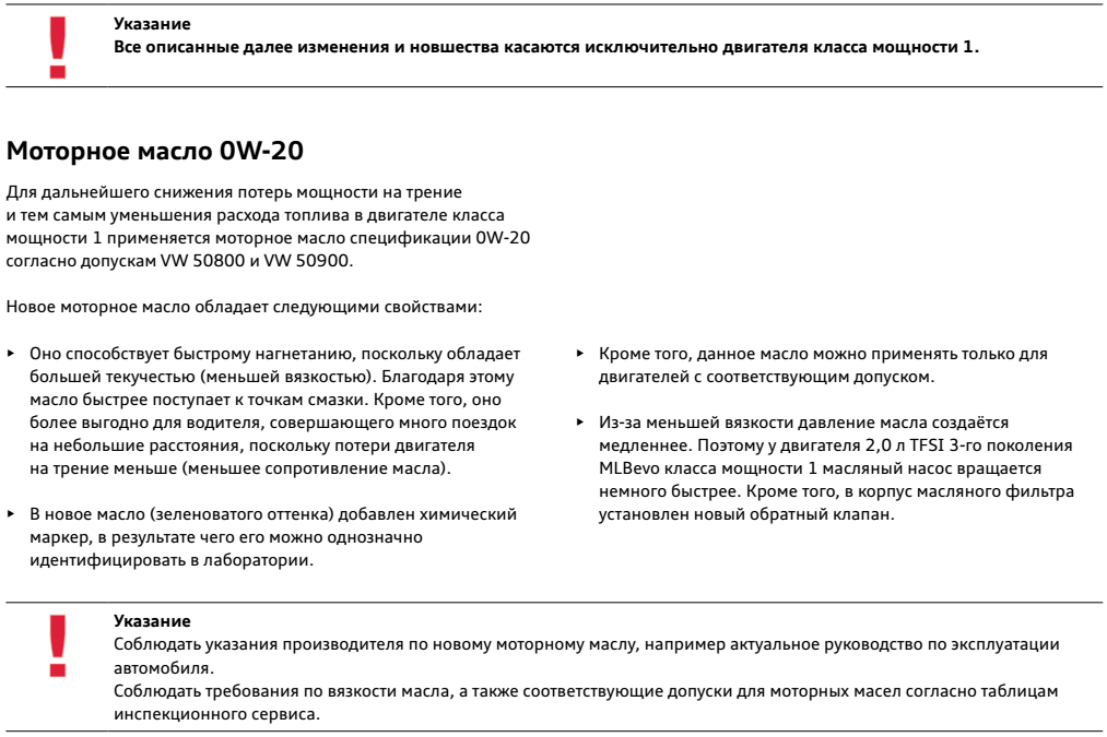 На самом деле, возможно Вы спорите совсем о разных двигателях у которых и рекомендации по маслу разные. Вот например для моего двигателя DEMB EA888 Gen3B в документации написана такая рекомендация: Но эта рекомендация только для моторов класса мощности 1. У них имеются конструктивные изменения специально под это моторное масло. Например в свою Октавию с двигателем EA211 1.4TSI я заливал по рекомендации ВАГа масло 5W-40 и с двигателем было все в порядке.