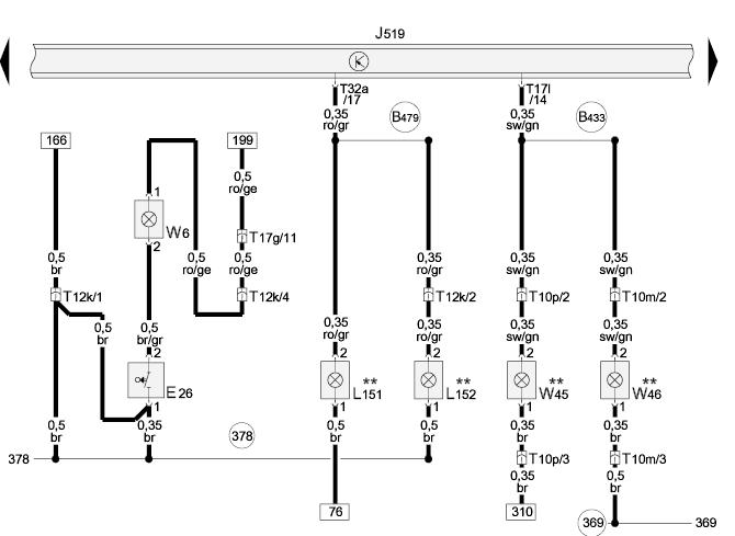 БАРДАЧЕК: Блок J519 - Блок управления бортовой сети Вся проводка по умолчанию подключается через 12 контактный штекерный разъем (пишу как не покупать эту проводку). 1. W6 - Лампа подсветки нужного нам ящика 2. + контакт лампы к блоку J519 на черный 17 контактный разъем. 17 контакт. 3. - к выключателю подсветки (доводчику) E26 4. - от доводчика к земле. - коричнивый