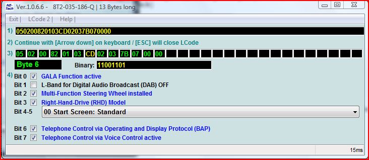 У нас также Voice control for phone with concert: 77 - Telephone -> Coding 07 -> change the second from last digit to a 2 (Eg mine Previous change 001300 post change 001320) 47 Radio -> Coding 07 -> Long code helper -> Byte 6 -> Bit 7 tick telephone control via voice control active должен быть блок 56, а не 47!