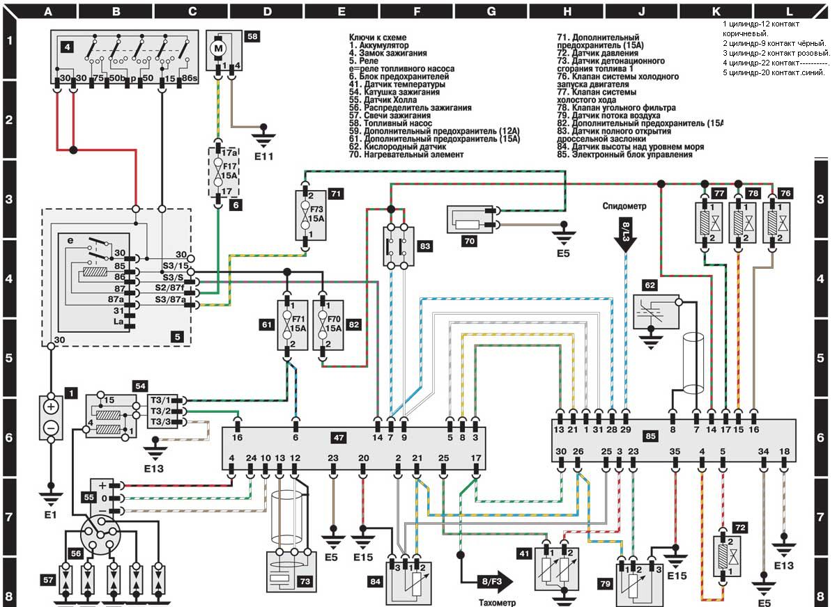 Re: ЯНВАРЬ НА АУДИ на этой схеме № 79 "Датчик потока воздуха" - наверное и есть потенциометр? т.е. по сине-желтому проводу с топливного ЭБУ(контакт 26) на VEZ (контакт 21) идет сигнал с ПНД?