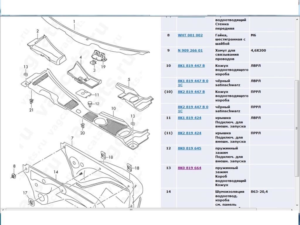 нашёл обратную сторону схемы NEW!!! 8K1 819 408 A - Решетка для защиты от листвы. Схема ТУТ А именно кожух водоотводящего короба - давно искал клипсу его крепления, №13 8K0819664 фотку прилагаю в альбоме http://www.audi-club.ru/forum/picture.php?albumid=4147&pictureid=23650