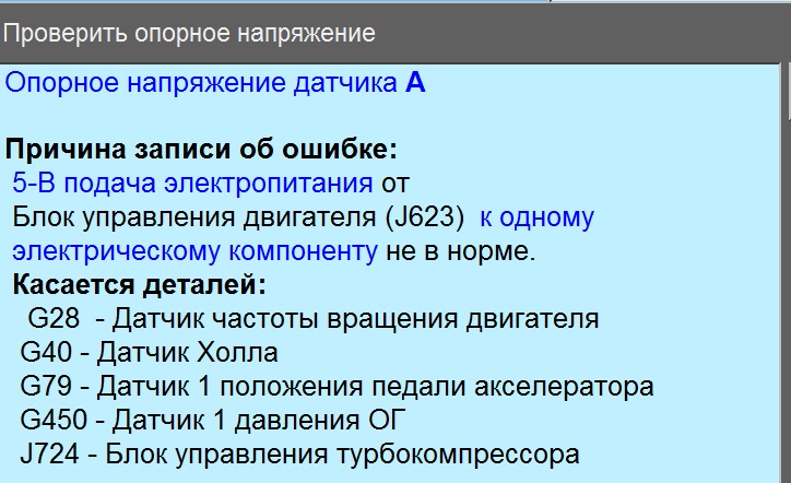 Да мне не понятно. Датчик г40, г28 и г450. Что это??? Педаль газа ??? При чём тут? Если ошибку кидает, это не значит надо всё в подряд менять))) Р0641 Geberreferenzspannung 'A ' Unterbrechung. Что за датчик подразумевается??? Есть русское название или немецкое? PS машина на ходу, немецкие специалисты в этот раз не обосрались))) машину почили меньше, чем 24 часа, с учётом нашли проблему, заказали деталь, поставили, забрав машину , я укатил на ней в отпуск ))) и они не работают с VCDS, это типа мы все диагносты приофессионалы с VCDS)))