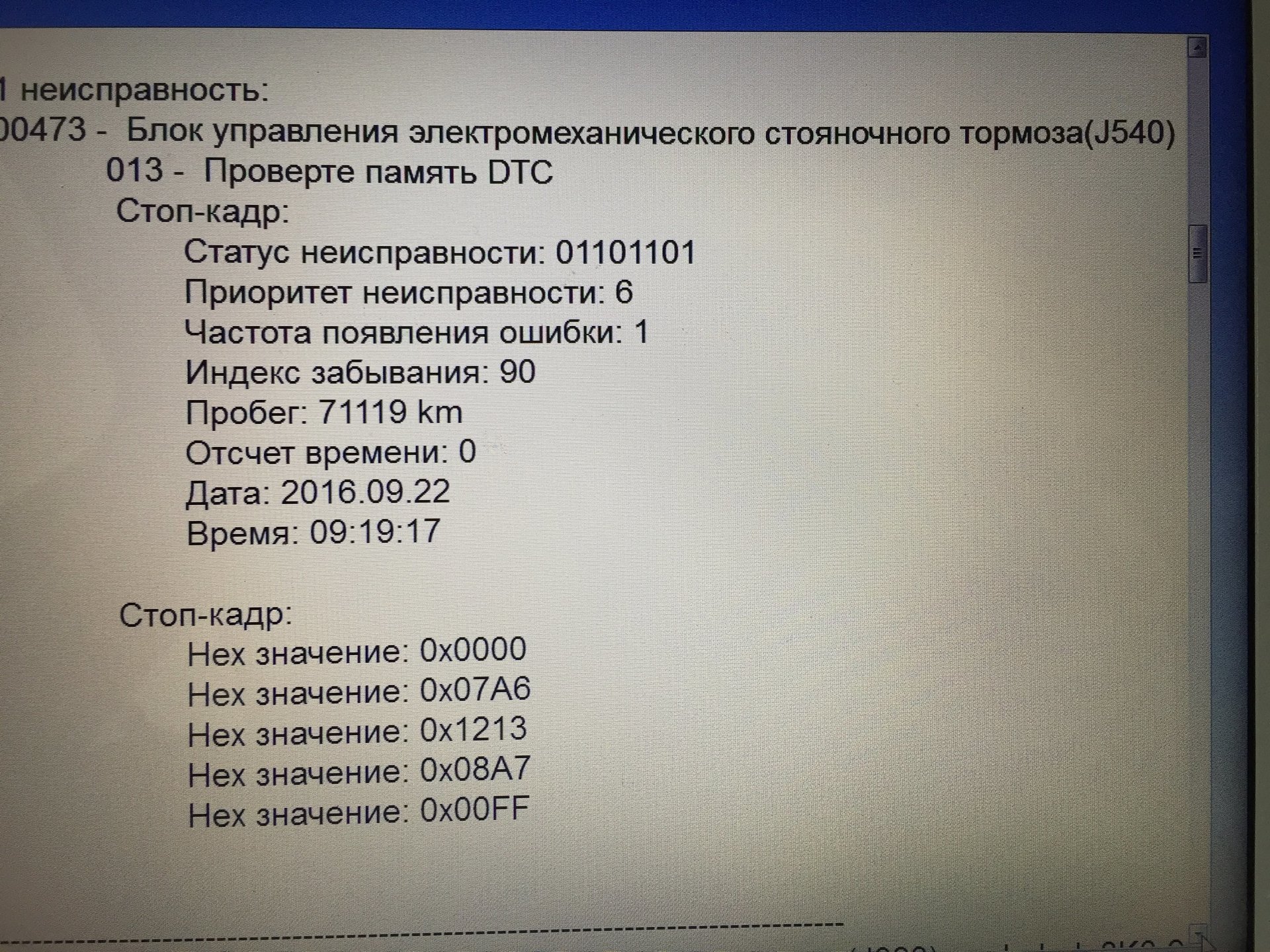 Привет. Подскажите, что за неизвестные ошибки мотора на audi q5 2.0tfsi 2015г. после дтп. И почему не скидываются ошибки по аирбэгам, ведь ошибки по краш дате не видно? Код: VIN: WAUZZZ8R4GA087181 Пробег:: 14030km-8717miles ------------------------------------------------------------------------------- Контроллер 01: Двигатель (J623-CNCE) Описания: Нет Номер детали SW: 8R2 907 115 C HW: 8T2 907 115 Компонент:: 2.0l R4 TFSI H13 0001 Ревизия: --H13--- Кодировка: 2A2A00322426010B2000 Код сервиса:: WSC 06208 000 00000 ASAM установки: EV_ECM20TFS0208R2907115C 001001 ROD: Недоступно VCID: 366931A889F1D38E94-8062 Нет инф-ии ASAM для: "EV_ECM20TFS0208R2907115C" (AU48) 5 ошибок найдено: 15048 - ROD - Неизвестный код ошибки - 00 [038] Периодически - Не подтверждено - Проверено после сброса памяти Момент неисправности: Статус ошибки: 00000001 Приоритет ошибки: 2 Частота ошибки: 2 Пробег:: 14038 km Дата: 2016.08.04 Время: 02:17:03 15090 - ROD - Неизвестный код ошибки - 00 [039] Не подтверждено - Проверено после сброса памяти Момент неисправности: Статус ошибки: 00000001 Приоритет ошибки: 2 Частота ошибки: 3 Пробег:: 14038 km Дата: 2016.08.04 Время: 02:05:31 20646 - ROD - Неизвестный код ошибки - 00 [039] Не подтверждено - Проверено после сброса памяти Момент неисправности: Статус ошибки: 00000001 Приоритет ошибки: 2 Частота ошибки: 1 Пробег:: 14038 km Дата: 2016.08.04 Время: 02:05:25 15282 - ROD - Неизвестный код ошибки - 00 [167] ЧЕК ВКЛ - Не подтверждено - Проверено после сброса памяти Момент неисправности: Статус ошибки: 00000001 Приоритет ошибки: 2 Частота ошибки: 1 Пробег:: 14038 km Дата: 2016.08.04 Время: 02:16:16 22055 - ROD - Неизвестный код ошибки - 00 [039] Не подтверждено - Проверено после сброса памяти Момент неисправности: Статус ошибки: 00000001 Приоритет ошибки: 6 Частота ошибки: 1 Пробег:: 14038 km Дата: 2016.08.04 Время: 02:05:21 Готовность: 1110 0001 ------------------------------------------------------------------------------- Контроллер 03: ABS/ESP (J104) Описания: 8R0-907-379.clb Номер детали SW: 8R0 907 379 BF HW: 8R0 907 379 BF Компонент:: ESP8 quattro H09 0020 Ревизия: -------- Номер лицензии: -------------- Кодировка: 2D5D4C01 Код сервиса:: WSC 06335 000 00000 VCID: 050B86648C9788164D-8050 3 ошибок найдено: 00473 - Блок управления электромеханического стояночного тормоза(J540) 013 - Проверте память DTC Момент неисправности: Статус ошибки: 01101101 Приоритет ошибки: 6 Частота ошибки: 1 Сброс счетчика: 43 Пробег:: 14038 km Индикация времени: 0 Дата: 2016.08.04 Время: 01:42:15 Момент неисправности: Прогр.знач-е: 0x0000 Прогр.знач-е: 0x0782 Прогр.знач-е: 0x001A Прогр.знач-е: 0x0997 Прогр.знач-е: 0x0000 01044 - Блок управления закодирован неправильно 000 - - Момент неисправности: Статус ошибки: 01100000 Приоритет ошибки: 3 Частота ошибки: 1 Сброс счетчика: 43 Пробег:: 14038 km Индикация времени: 0 Дата: 2016.08.04 Время: 01:42:15 Момент неисправности: Прогр.знач-е: 0x0000 Прогр.знач-е: 0x0782 Прогр.знач-е: 0x0015 Прогр.знач-е: 0x1097 Прогр.знач-е: 0x0000 01309 - Блок управления усилителя рулевого управления(J500) 004 - Нет сигнала/связи Момент неисправности: Статус ошибки: 01100100 Приоритет ошибки: 6 Частота ошибки: 1 Сброс счетчика: 43 Пробег:: 14038 km Индикация времени: 0 Дата: 2016.08.04 Время: 01:42:15 Момент неисправности: Прогр.знач-е: 0x0000 Прогр.знач-е: 0x0782 Прогр.знач-е: 0x000C Прогр.знач-е: 0xE397 Прогр.знач-е: 0x0000 ------------------------------------------------------------------------------- Контроллер 08: Климат-контроль (J255) Описания: Ошибка ссылки! Номер детали SW: 8K1 820 043 AQ HW: 8K1 820 043 AQ Компонент:: KLIMA 3 ZONEN H04 0122 Ревизия: C1000000 Номер лицензии: 01161120152276 Кодировка: 642102C000 Код сервиса:: WSC 06335 000 00000 VCID: 77F7FCACC67BEA864F-8022 1 Ошибка найдена: 04000 - Ограничения; вызванные сигналом удара 000 - - Момент неисправности: Статус ошибки: 01100000 Приоритет ошибки: 3 Частота ошибки: 1 Сброс счетчика: 43 Пробег:: 14038 km Индикация времени: 0 Дата: 2016.08.04 Время: 01:40:12 -------------------------