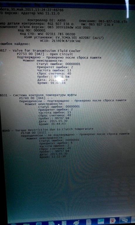 Мужики, подключал сегодня шнурок и вот что вылезло Адрес 01: Электроника двигателя Labels: 06C-909-559-ASN.LBL Блок управления: 8E0 909 559 N Компонент: 3.0L V6/5V 0010 Кодировка: 0004751 Мастерская #: WSC 00105 VCID: 40F3971B538D 5 Найдены неисправности: 17546 - Ряд 2, адаптация смеси (на холостом ходу): переобеднение смеси в системе P1138 - 001 - верхнее предельное значение превышено 17544 - Ряд 1, адаптация смеси (на холостом ходу): переобеднение смеси в системе P1136 - 001 - верхнее предельное значение превышено 16486 - Расходомер воздуха-G70: слишком низкий уровень сигнала P0102 - 002 - нижнее предельное значение не достигнуто - Непостоянно 17550 - Учет нагрузки, не достигнуто нижнее пороговое значение P1142 - 002 - нижнее предельное значение не достигнуто - Непостоянно 17775 - Управление зажиганием, цил. 5: обрыв цепи P1367 - 004 - нет сигнала/связи - Непостоянно Готовность: 0000 0000 ------------------------------------------------------------------------------- Адрес 02: Электроника КП Labels: 01V-927-156.LBL Блок управления: 8E0 927 156 G Компонент: AG5 01V 3.0l5V RdW 0809 Кодировка: 0000001 Мастерская #: WSC 63351 VCID: 3217CDD3ED21 1 неисправность: 18265 - Сигнал нагрузки: сообщение об ошибке от блока управления двигателя P1857 - 003 - механическое повреждение - Непостоянно Можете подсказать что делать, менять?