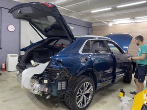 Я видимо немного консервативен, мне конечно нравится матовый оттенок и вообще закатываю в пленку первый раз, поэтому для себя выбрал прозрачный Сантек. Цвет Galaxy Blue оказался очень интересным и в зависимости от освещения меняет световую палитру от светлого к темному. Соответственно захотелось оставить оригинал. А пленка, ну а пленка - это мой первый эксперимент ) со слов менеджера, который вёз мне авто на эвакуаторе в тюнинг, притормаживали мерсы и бмв, чтобы рассмотреть машину. Q8 пока ещё мало на дорогах, этим они и вызывают интерес. Ну и цвет, скажу вам, не часто такой встречается.