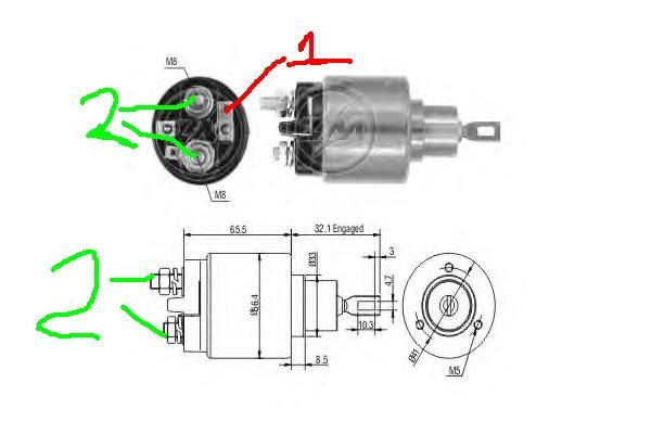 цифра 1 с замка зажигания (при подаче напряжения реле выдвигает бендикс и замыкает контакты 2) цифра 2 вверху +, внизу масса стартера. при их замыкании бендикс вращается. подай + с верхней клеммы стартера (2) на контакт номер 1 если не поможет попробуй замкнуть все 3 контакта