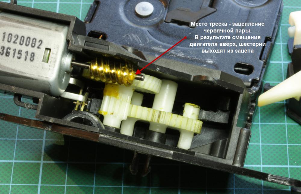 Эта пружинка помогает дотягивать дверь, а треск и выстрелы из "калаша" идут из крышки багажника. Износилась шестеренка в моторчике, умельцы вытаки вытачивают и ставят новую