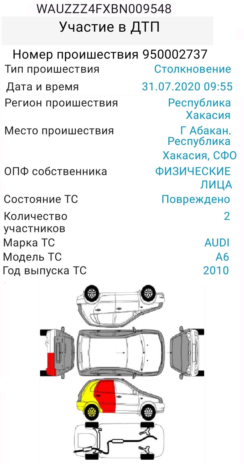 В каком месте? Я тоже скачивал отчет, спрашивал предыдущего хозяина об этом ДТП, он сказал то же самое. Поехал в Новосибирск, продал свой С7 и на след день полетел оттуда в Абакан за этим Оллроудом. У другого авто (Хёнде) царапка на бампере тоже и больше ничего. Не знаю, почему дверь красным закрашена в отчете,
