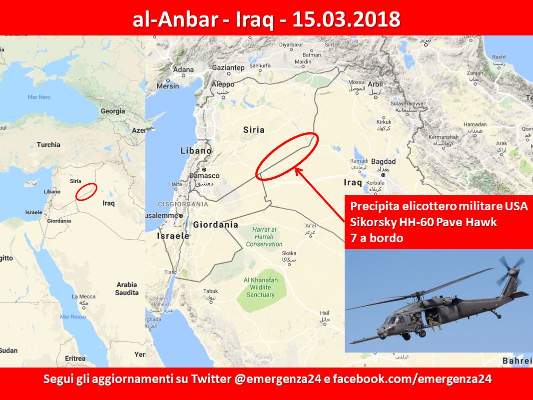 На границе Ирака и Сирии в районе города Аль-Каим (провинция Анбар) разбился американский военно-транспортный вертолет HH-60 Black Hawk. На борту было 7 человек. По предварительным данным, как минимум часть из них погибли (по другим данным - погибли все). Вертолет перевозил оружие для неназванного источника. Свидетельств, что по вертолету велся огонь нет, но в Пентагоне не исключают, что машина была обстреляна. Спасательная команда выдвинулась к месту падения вертолета. ССОшный вертолёт уронился.