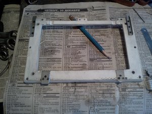 итак,продолжаем колхоз. в закромах в гараже имеется семидюймовый телевизор "Пролежни" и свеже отремонтированная китайская двд-балалайка типа JVC,а так же желание все это впендюрить в машину. с парприза снимается пластиковая панель куда крепятся воздуховоды, кнопки, мафон и управление печкой. с помощью пилки,кусачек,напильника и всем извесной матери лишнее вырезается. телевизор разбирается,под переднюю часть делается рамка для крепления вместо воздуховодов и кнопок,к ней же сзади крепим оставшиеся потроха телика. поскольку при работе телик сильно греется,на задней стенке поставил небольшой кулер с автоматическим включением.выход воздуха сверху телика,щели прикрыты сеточкой.вот что получилось.