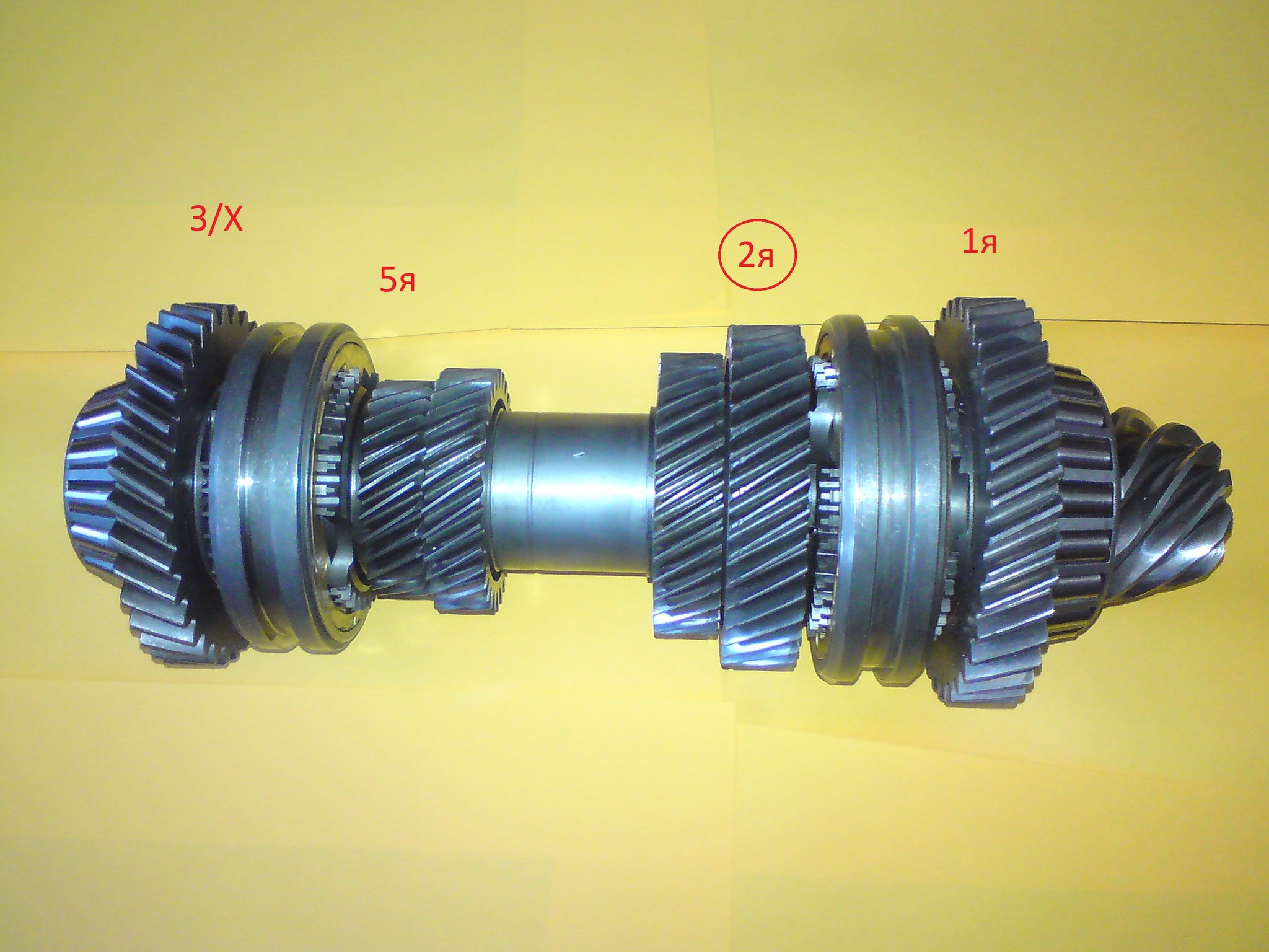 Я писал ранее, когда шестерня второй передачи стягивается высоты игольчатого подшипника на котором она крутится хватает чтоб перепрыгнуть стопор ведь стопор нужен не шестерне 2ой передачи а шестерне 3ей передачи а шестерня второй передачи просто уже упирается в шестерню третьей передачи. Так что тащишь за шестерню второй передачи и стягиваешь шестерню третьей передачи тем самым с вала. Похоже было экстренное торможение без сцепления на 4ой скорости по-этому шестерня 4ой чуть шевелится. Синхронизаторы 1ой и 2ой одинаковые, я на 2ю ставил синхронизатор тот что получше из двух. Так то стопор можно и по-шире заказать только ждать придется.\ По-хорошему вал этот аккуратно зажимаешь в тиски со стороны червяка и когда он вертикально неподвижно стоит в нормальных тисках вся эта работа по разборке-сборке занимает один час примерно.