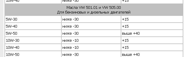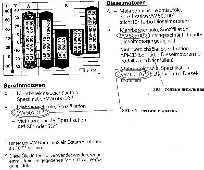 Я призываю Вас тоже очень внимательно посмотреть по указанной Вами ссылке! Там нигде нет ни строчки, ни слова о том, что Единственное место, на которое Вы, возможно, опираетесь в своих утверждениях, это вот эта часть таблички: http://www.audi-club.ru/forum/attachment.php?attachmentid=286610&stc=1&d=1346133987 Там перечислены 501_01 вместе с 505, и обозвано как масла для бензиновых и дизельных двигателей. Ну, так и правильно! Потому, что во-первых, именно 501_01 и есть именно для бензиновых и дизельных двигателей, а во-вторых, эта часть таблицы и содержит в себе перечисление чисто дизельной 505 и универсальной (бензин и дизель) 501_01. Вот так! Вот еще одна ссылка. На инструкцию по эксплуатации моей машины. http://www.audi-club.ru/forum/attachment.php?attachmentid=286612&stc=1&d=1346135728 Здесь сам изготовитель говорит об этом: http://www.audi-club.ru/forum/attachment.php?attachmentid=286619&stc=1&d=1346135896 И еще раз спецификация от производителя: VW 500.00 Легкотекучие энергосберегающие всесезонные масла SAE 5W-30, 5W-40, 20W-30 или 10W-40, предназначенные для применения в бензиновых двигателях. Базовые требования: соответствуют требованиям АСЕА А3-96. VW 501.01, универсальное масло для бензиновых и дизельных двигателей с непосредственным впрыском, соответствует требованиям класса АСЕА А2; сезонные или всесезонные масла, должна быть проверена совместимость с эластомерными прокладками; для турбодизелей - только в сочетании с - VW 505.00; VW 502.00, масло для бензиновых двигателей с повышенной эффективной мощностью и непосредственным впрыском, основой являются требования класса АСЕА А3; VW 503.00, всесезонное масло для бензиновых двигателей с непосредственным впрыском, предусмотрен продленный интервал замены, имеет пониженную высокотемпературную вязкость с целью сбережения топлива; основой являются требования класса АСЕА А3, предназначено только для двигателей, выпускаемых с мая 1999 г.; не применять для автомобилей прежних выпусков из-за низкой высокотемпературной вязкости, которая может привести к повреждению двигателя; VW 503.01, для бензиновых двигателей с турбонаддувом, предусмотрен продленный интервал замены; VW 505.00, масла для дизельных двигателей легковых автомобилей без и с турбонаддувом; соответствует требованиям класса АСЕА В3; всесезонные масла; должна быть проверена совместимость с эластомерными прокладками; VW 505.01, всесезонное моторное масло вязкости SAE 5W-40 для дизельных двигателей с насос-форсункой (Pumpe-Dmse); VW 506.00, всесезонные масла для дизельных двигателей легковых автомобилей с турбонаддувом; предусмотрен продленный интервал замены, имеют пониженную высокотемпературную вязкость с целью сбережения топлива, основой являются требования класса АСЕА В4; предназначены только для двигателей, выпускаемых с мая 1999 г.; не применять для автомобилей прежних выпусков из-за низкой высокотемпературной вязкости, которая может привести к повреждению двигателя. Я считаю, что моя точка зрения правильная и доказательна. Если Вы с ней не согласны, пожалуйста, аргументируйте доказательно и убедительно.