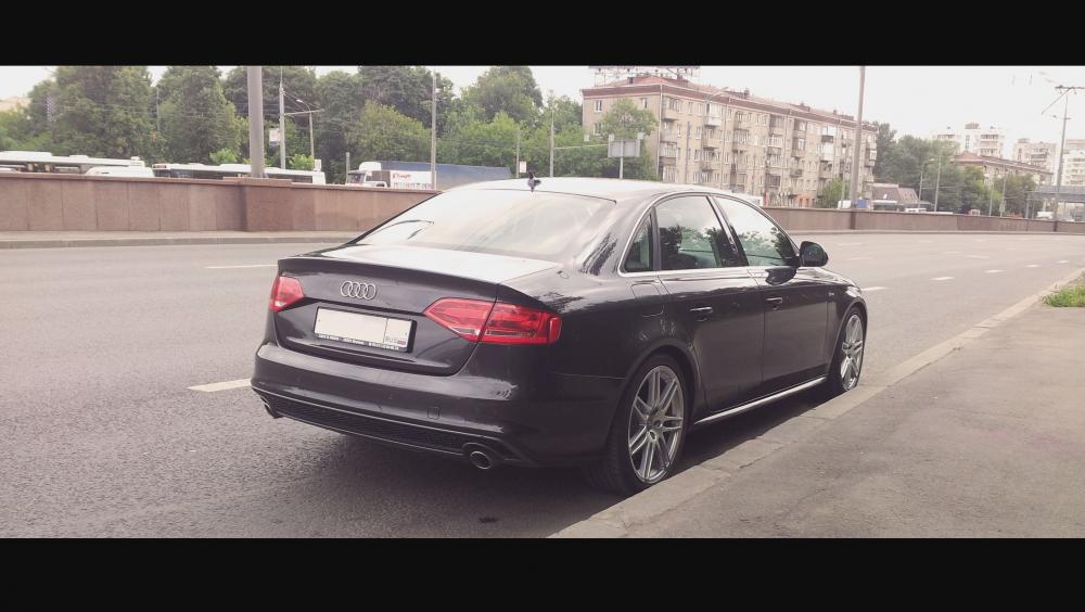 Комплектацию немного допиливал после завода =) Хотя с этой подвеской и дисками она и сошла с конвейера. Установил свежий задний бампер s-line от FL (A4 с 2013г.). Спойлера нет, не нравится он мне,- фотография так получилась. Пороги s-line и передний бампер от S4 с оригинальной "алюминиевой" губой. Из последнего поставил задние фонари аля A4 FL с диодной полосой без замены крышки багажника. В остальном, как у всех - без фанатизма
